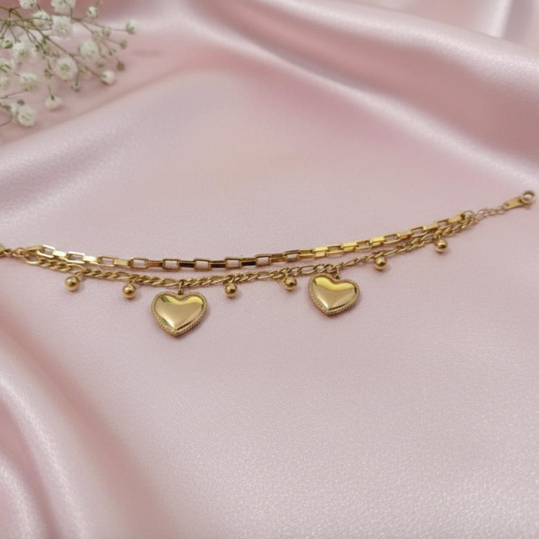 The Amore Bracelet represents a perfect balance between contemporary jewelry trends and timeless romantic symbolism. Featuring dual polished gold hearts, this piece serves as a constant reminder of love and deep personal connection. We designed this Gold Heart Charm Bracelet with a sophisticated layered aesthetic, combining different chain textures to create a look of effortless luxury. Because the warm gold tones complement any skin tone, the bracelet provides a radiant glow that enhances your natural style. Its delicate yet durable construction ensures that you can wear it with confidence from morning until night.