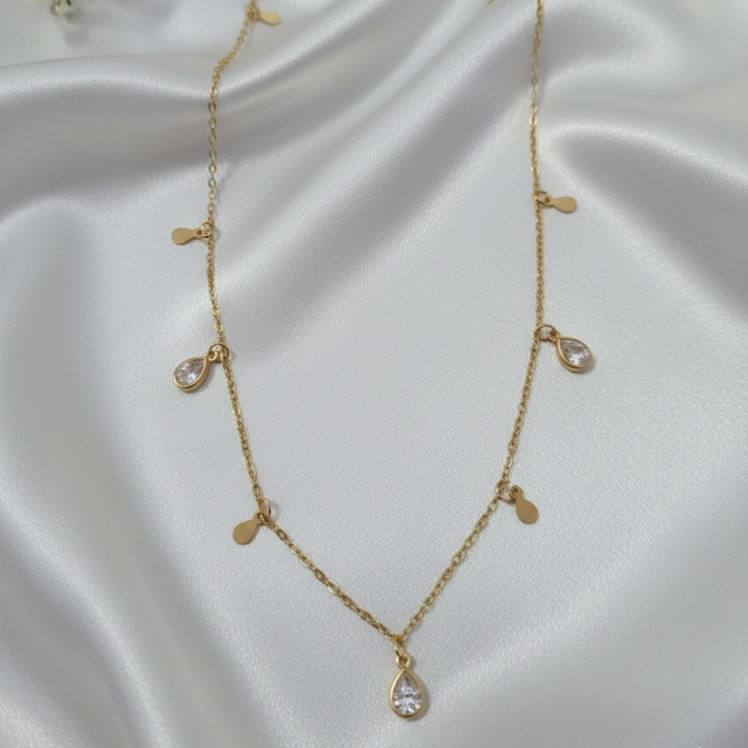 Interspersed between these shimmering stones are four solid gold teardrop drops. This creates a balanced and harmonious pattern that drapes gracefully along the collarbone. The necklace features a slim, durable gold chain with a secure lobster claw clasp and a branded circular tag, ensuring it remains comfortable for all-day wear. By choosing this piece, you are investing in an elegant accessory that balances a fragile appearance with premium structural integrity.