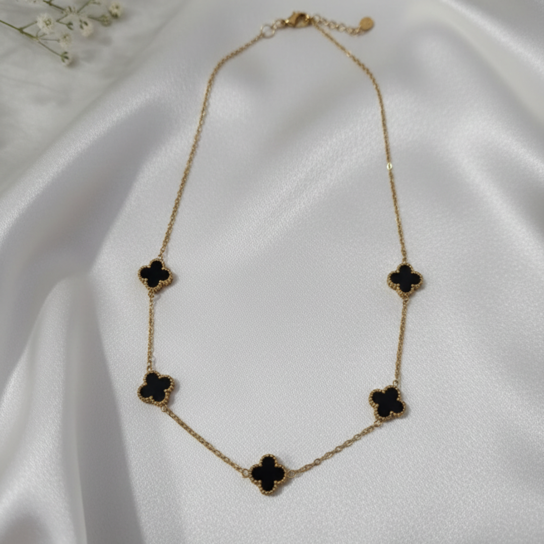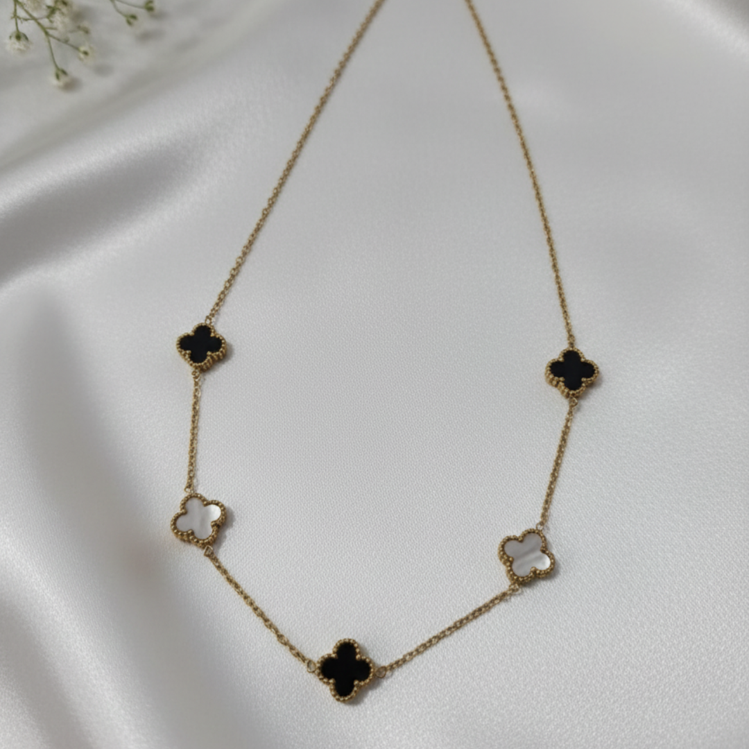 We designed this necklace for the modern individual who values intelligent design. Because each station features a deep black inlay and a shimmering mother-of-pearl finish, you can easily change your style. Therefore, it is simple to match any occasion or color palette.