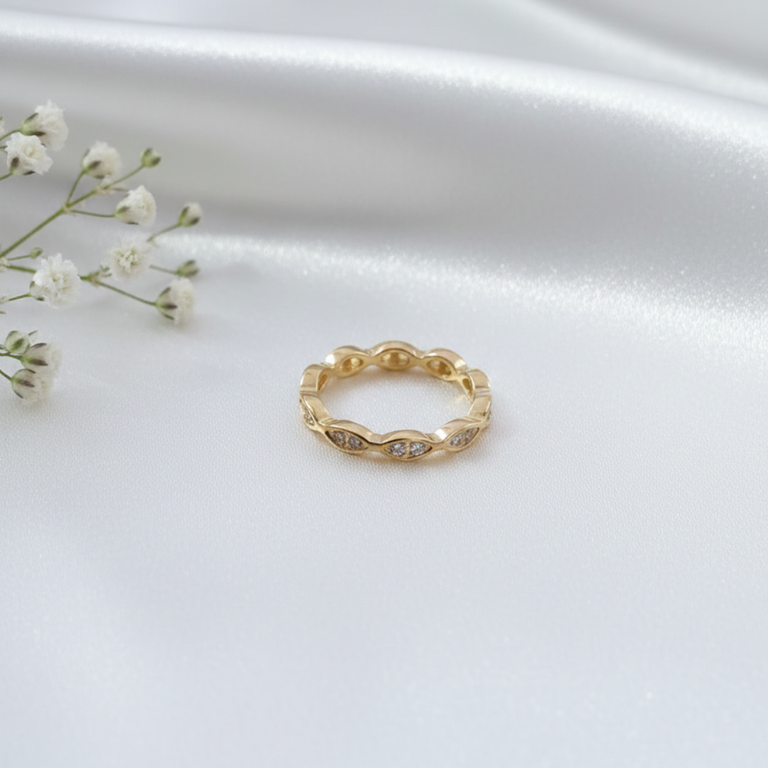 Superior craftsmanship is evident in every curve of the Intertwine Ring. Our master jewelers hand-set brilliant diamonds into each marquise-shaped station, maximizing the stone’s natural fire and brilliance. This Gold Eternity Ring is polished to a mirror shine, ensuring the metal remains lustrous even with frequent wear. Furthermore, the low-profile setting makes it an exceptionally practical choice for those with active lifestyles. By choosing this piece, you are investing in Elegant Stackable Jewelry that maintains its structural integrity and aesthetic appeal for years to come.