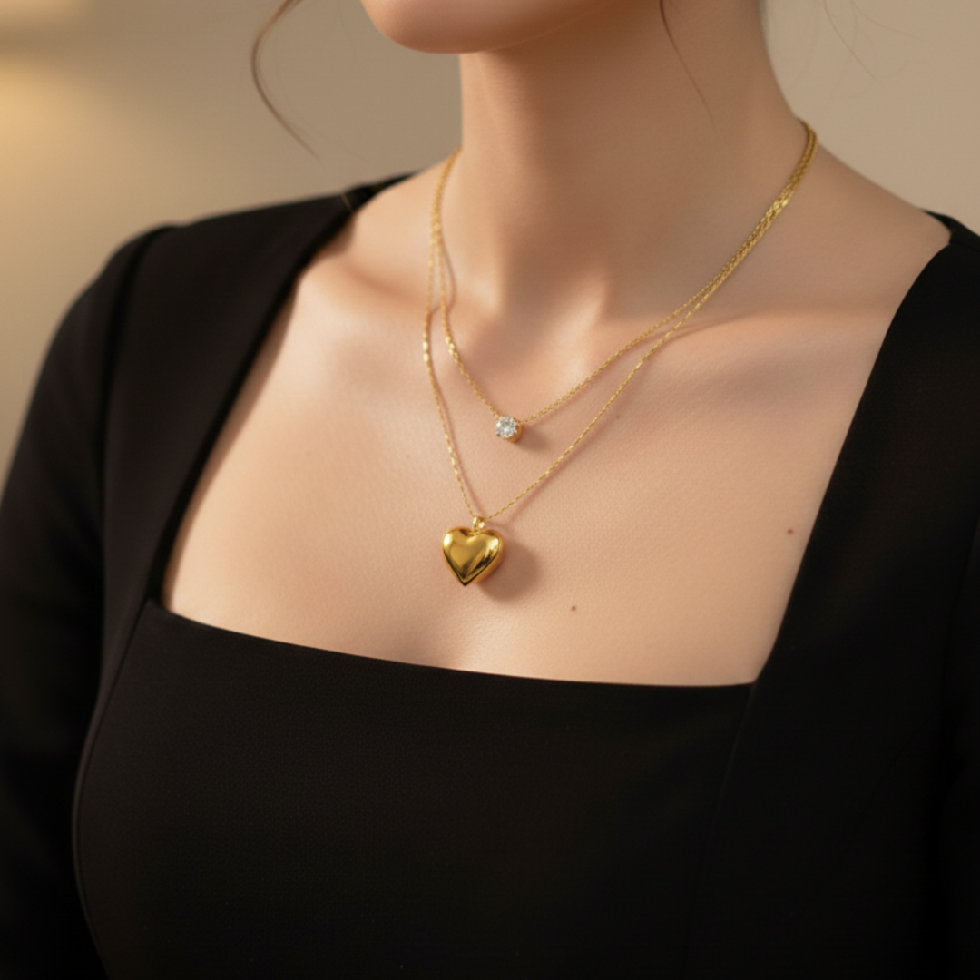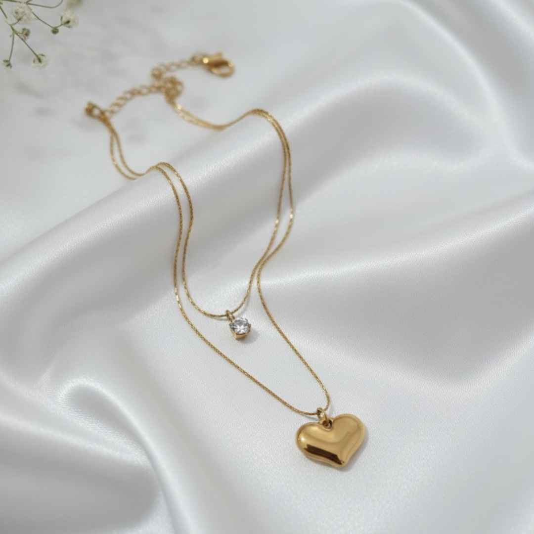 The Layer Pendant Set represents the peak of effortless styling. It offers a pre-curated look for jewelry stacking. This piece combines two distinct gold chains. It features a shimmering crystal and a puffy heart charm.