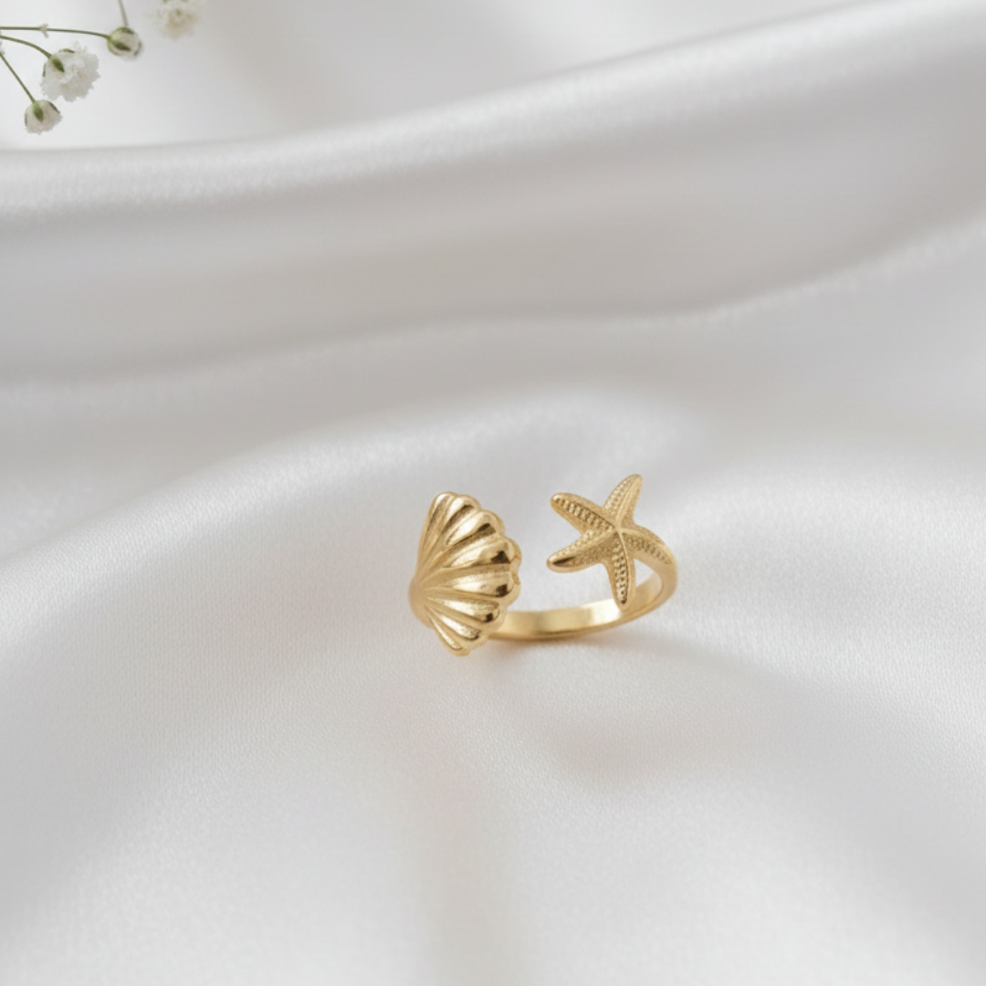 The Starfish Ring serves as a beautiful reminder of serene days spent by the shore. Featuring a unique open-ended design, this piece showcases a meticulously detailed starfish on one side and a polished seashell on the other. We crafted this Gold Shell Jewelry for the dreamer who carries the spirit of the ocean. Because it uses an adjustable band, the ring provides a perfect fit for any finger. Its radiant gold finish captures the warmth of the summer sun, ensuring you shine with every gesture.